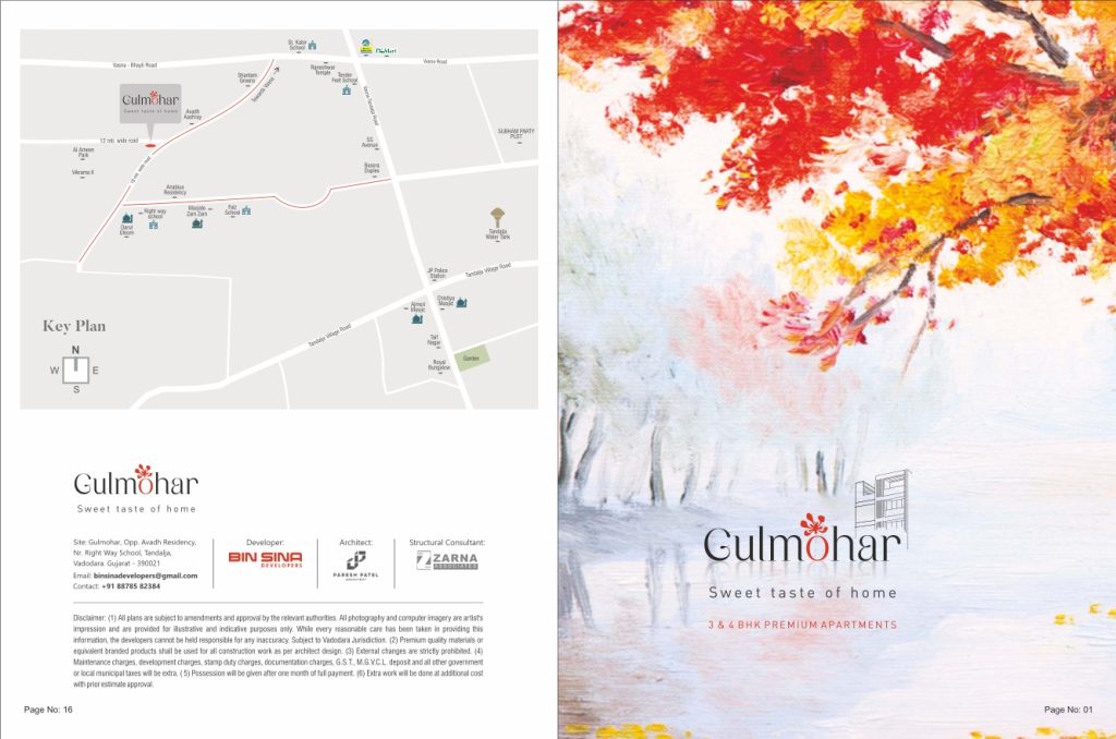 The developer of the Gulmohar project in Vadodara is Bin Sina Developers. The structural consultant is Darul Uloom, and the architect is Shantam Greens.