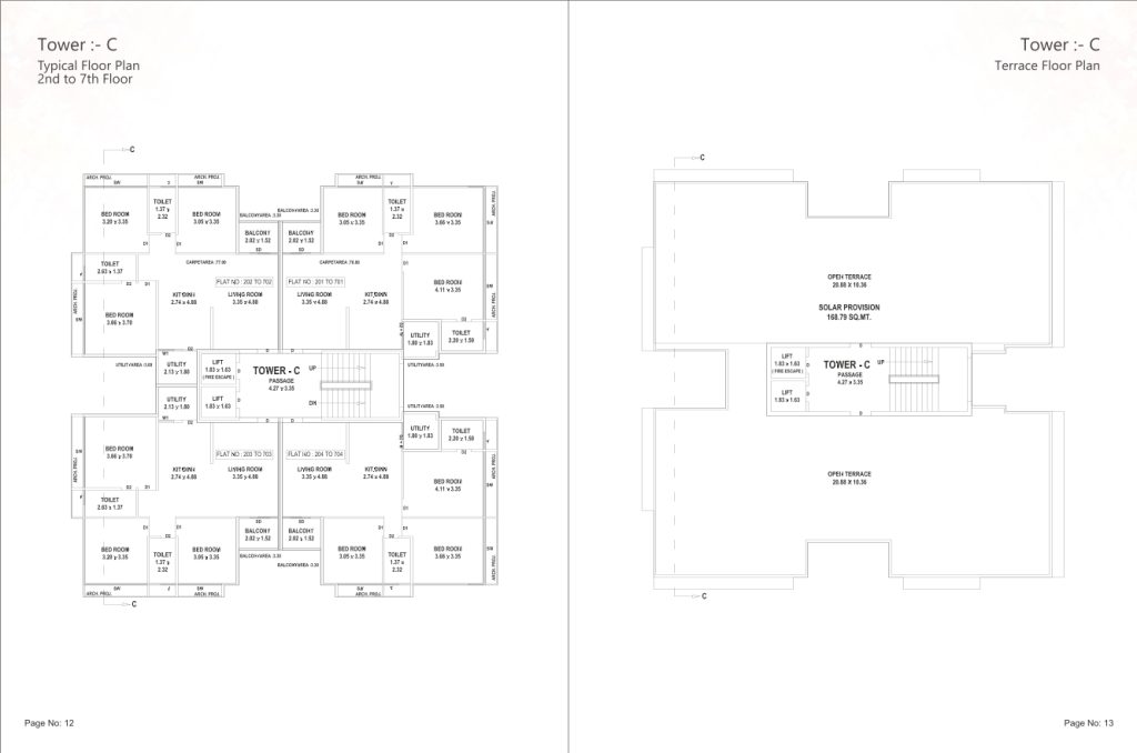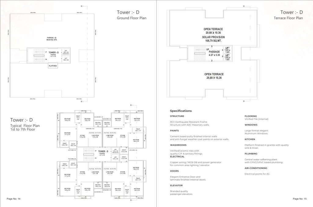 The specifications of the Gulmohar apartments in Vadodara include an earthquake-resistant RCC structure with AAC masonry walls, elegant entrance doors, laminate finished internal doors, vitrified/ceramic tile flooring, large format aluminum windows, granite-finished kitchen platforms with quality sink & mixer, quality CP & sanitary fittings in washrooms, central water softening plant, copper wiring, MCB DB, power generator for common area lighting/elevator, electrical points for air conditioning, and branded quality passenger elevators. These specifications ensure a high-quality living environment for residents at Gulmohar.